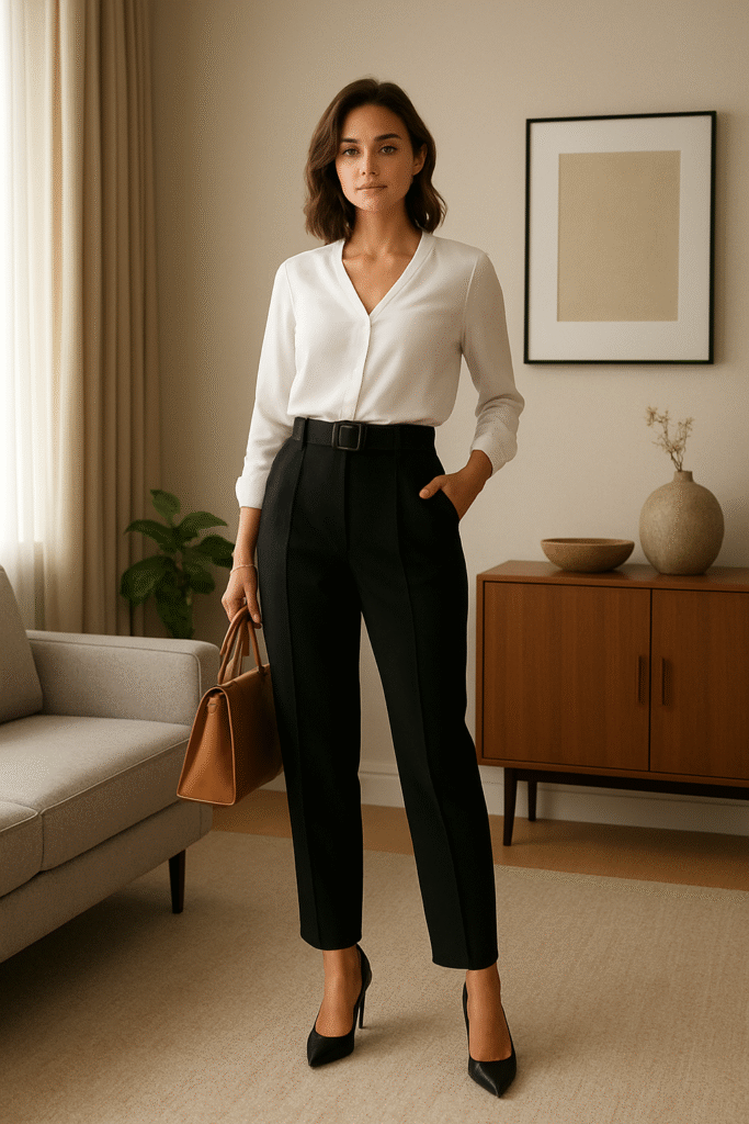 - Combinação Clássica: Para um visual infalível, combine sua calça de alfaiataria preta com uma camisa de seda ou crepe em tons neutros, como branco, off-white ou nude. Nos pés, um scarpin de bico fino finaliza a produção com um toque de poder.