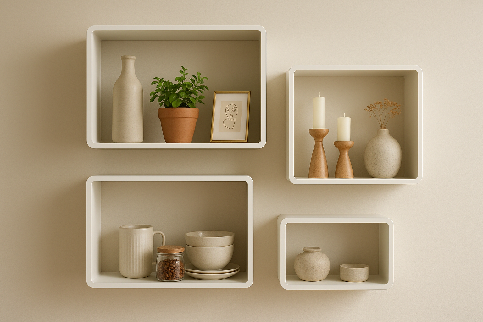 Feito para durar, um bom kit de nichos é produzido com materiais de alta qualidade, garantindo não apenas um acabamento premium que valoriza o espaço, mas também a resistência necessária para suportar seus objetos com segurança.